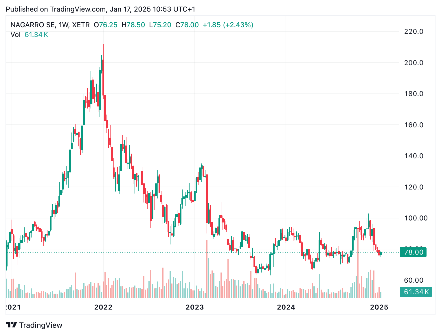 2024 brought the "show me" phase. Twice the stock rallied toward 100 EUR, as investors hoped the growth engine would restart. Twice it failed. November sealed it - when management withdrew long-term targets, the market lost its last reason for optimism.